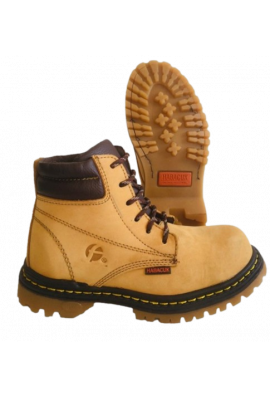 El calzado mod. 7077 FH es de nobuk color miel con casco de poliamida resistente al impacto (101.7+2 J) y compresión (11.135kN+0.2kN) de acuerdo a la norma NOM-113-STPS-2009. El forro es de cambrell completo antimicótico, resistente a la fricción, con excelentes características de frescura y desabsorción y absorción de agua. La suela es de elastómero. La planta está compuesta de fibra de celulosa diseñado para calzado de seguridad, estabilidad y distribución del peso del usuario, tiene un refuerzo en el talón de fibra compacta. Los ojillos son 5 orificios de cada lado, pegado y cosido. Disponible en talla 22 al 30.