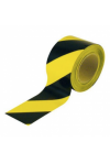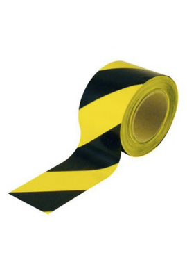 La cinta de señalización para delimitar áreas está en color amarillo con negro, tiene una medida de 2 pulgadas por 33 metros y una elongacion de 400 % antes de romperse.